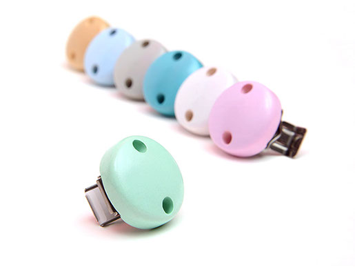Our Ø 35mm clip (three ventilation holes) has been tested and approved according to DIN EN 12586 and has been in use for more than 25 years. The clip can therefore be used on pacifier holders or pacifier chains!